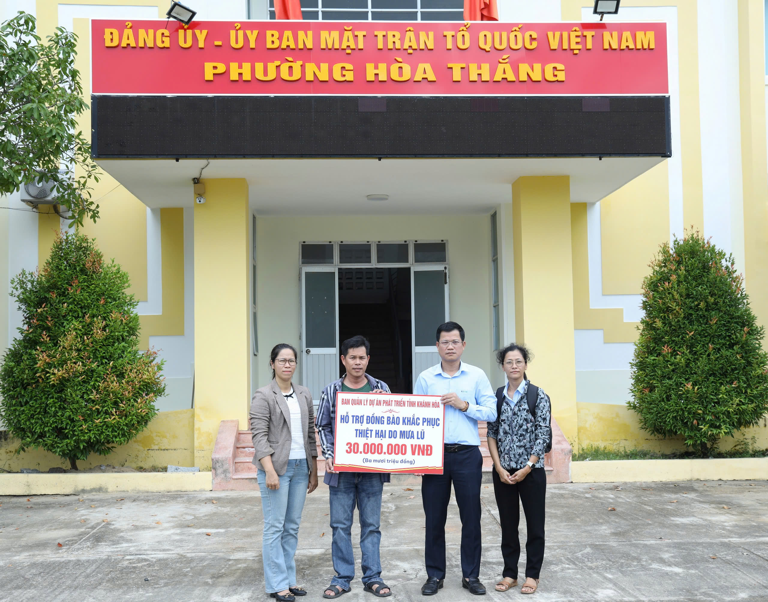 Lãnh đạo Ban Quản lý dự án Phát triển tỉnh trao bảng tượng trưng ủng hộ người dân Phường Bắc Nha Trang khắc phục thiệt hại do mưa lũ.