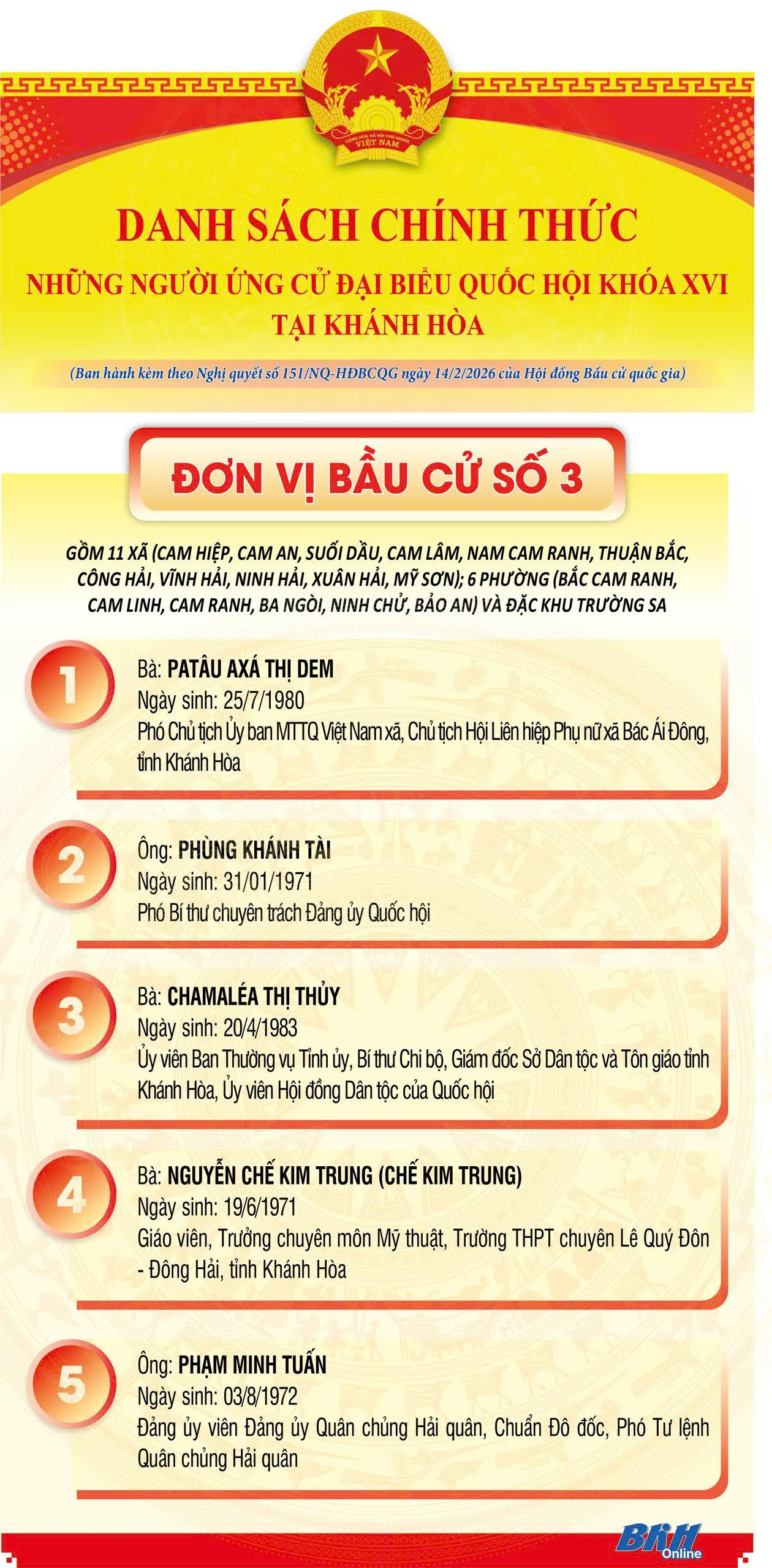 Danh sách chính thức những người ứng cử đại biểu Quốc hội khóa XVI tại Khánh Hòa như sau: