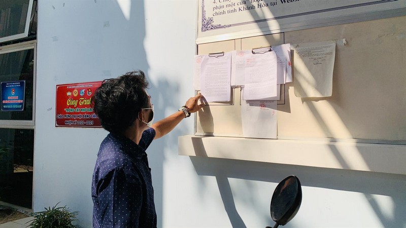 Ảnh: Người dân xem thông báo thu hồi đất đối với hạng mục Xây dựng kè và đường Nam Sông Cái Nha Trang được niêm yết tại UBND phường Vạn Thắng.