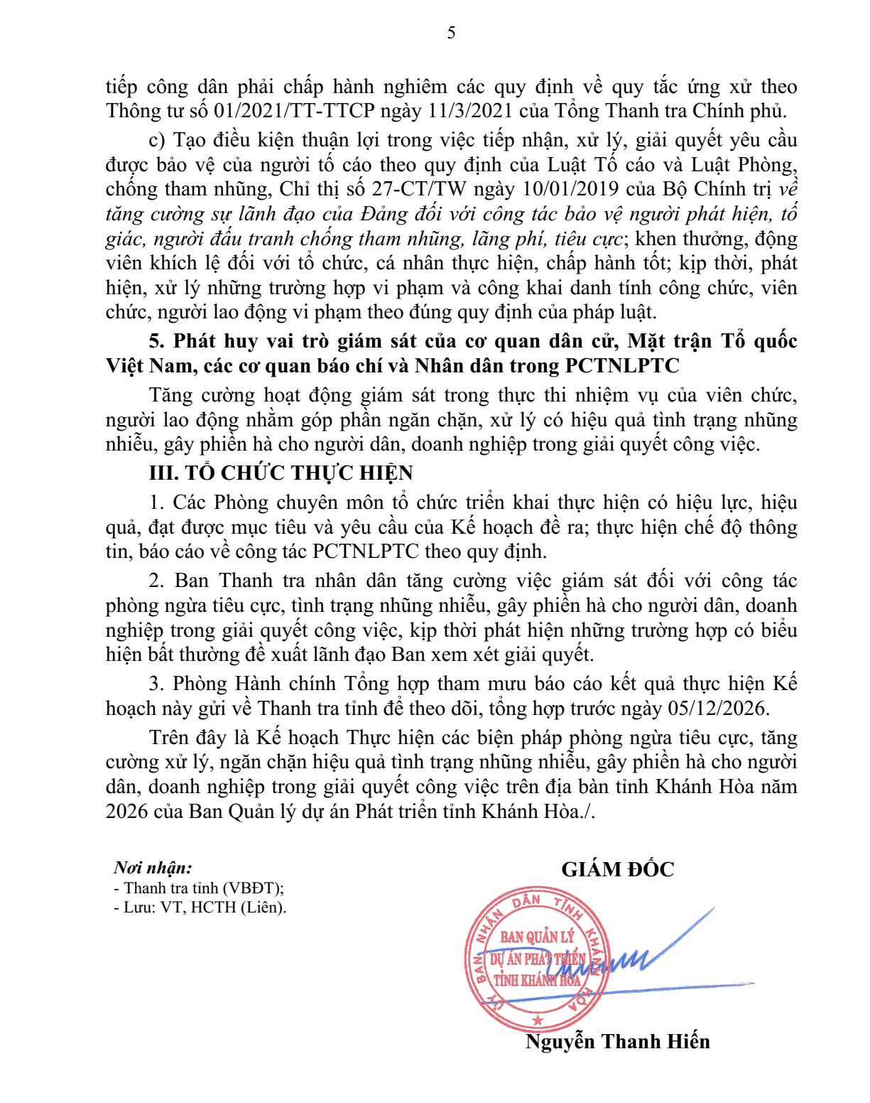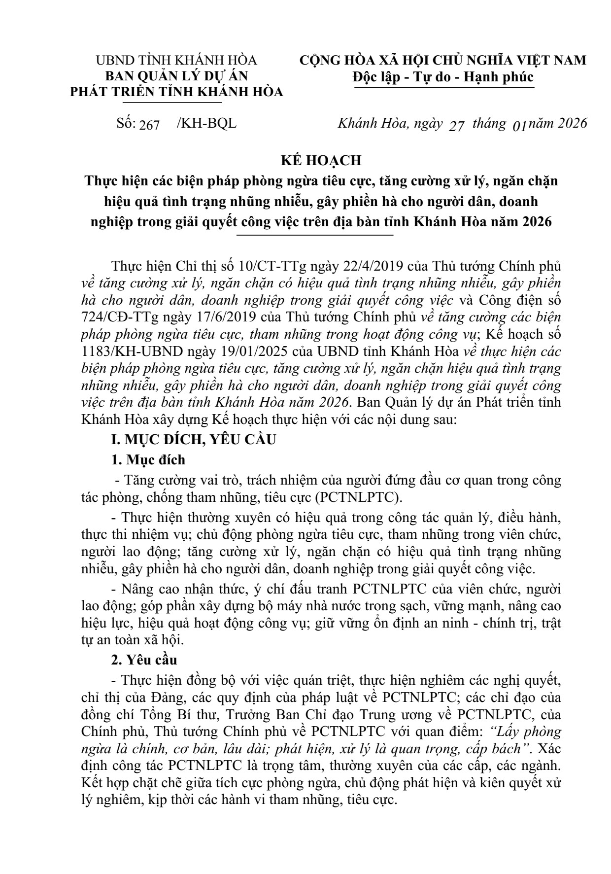 Kế hoạch thực hiện các biện pháp phòng ngừa tiêu cực, tăng cường xử lý, ngăn chặn hiệu quả tình trạng nhũng nhiễu, gây phiền hà cho người dân, doanh nghiệp trong giải quyết công việc trên địa bàn tỉnh Khánh Hòa năm 2026