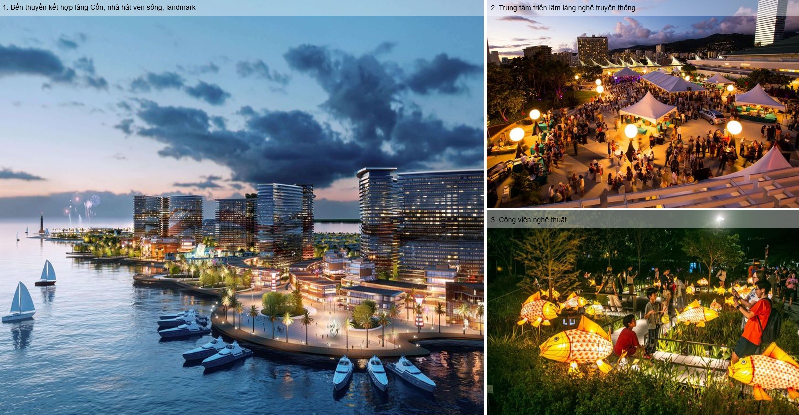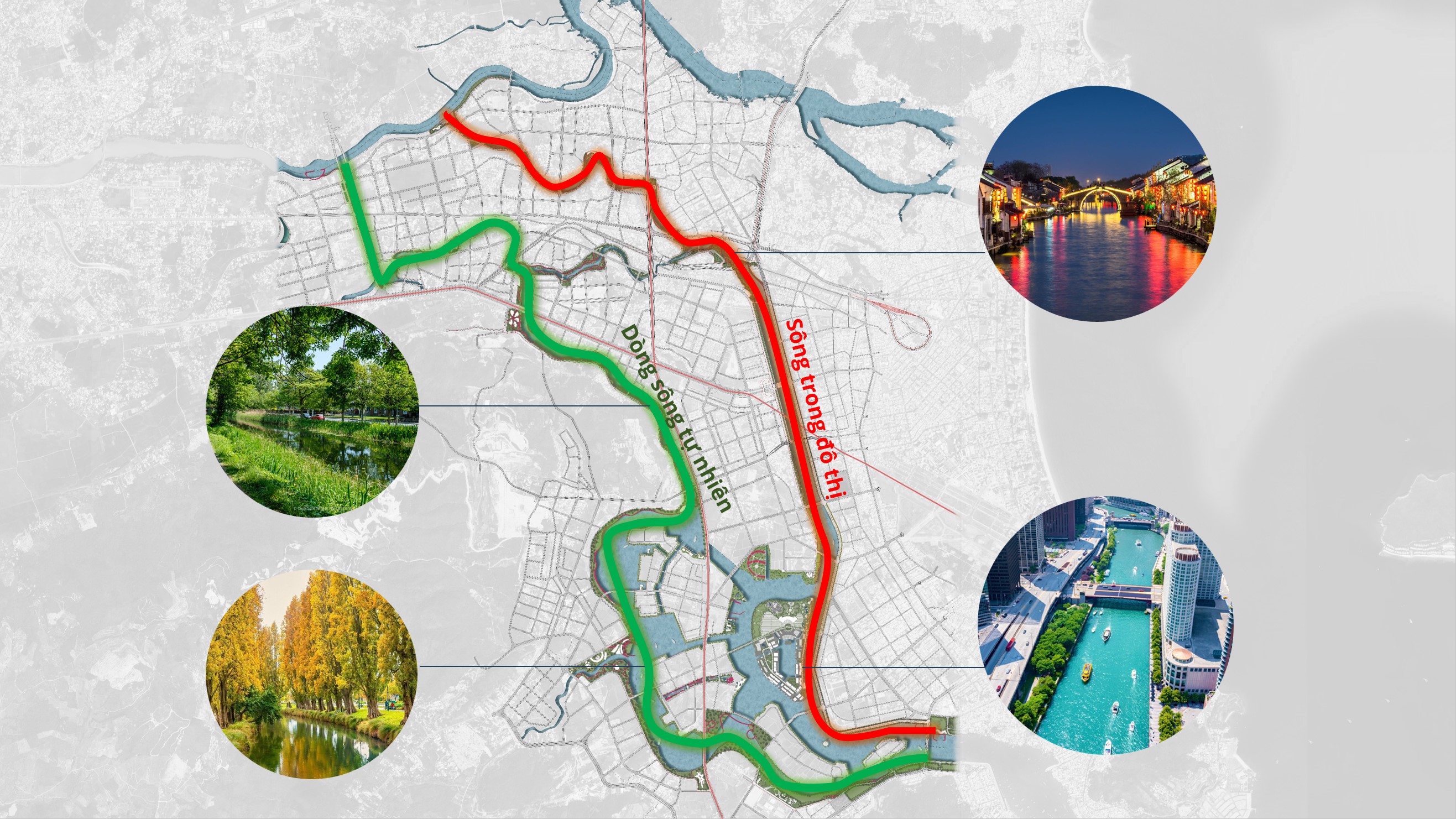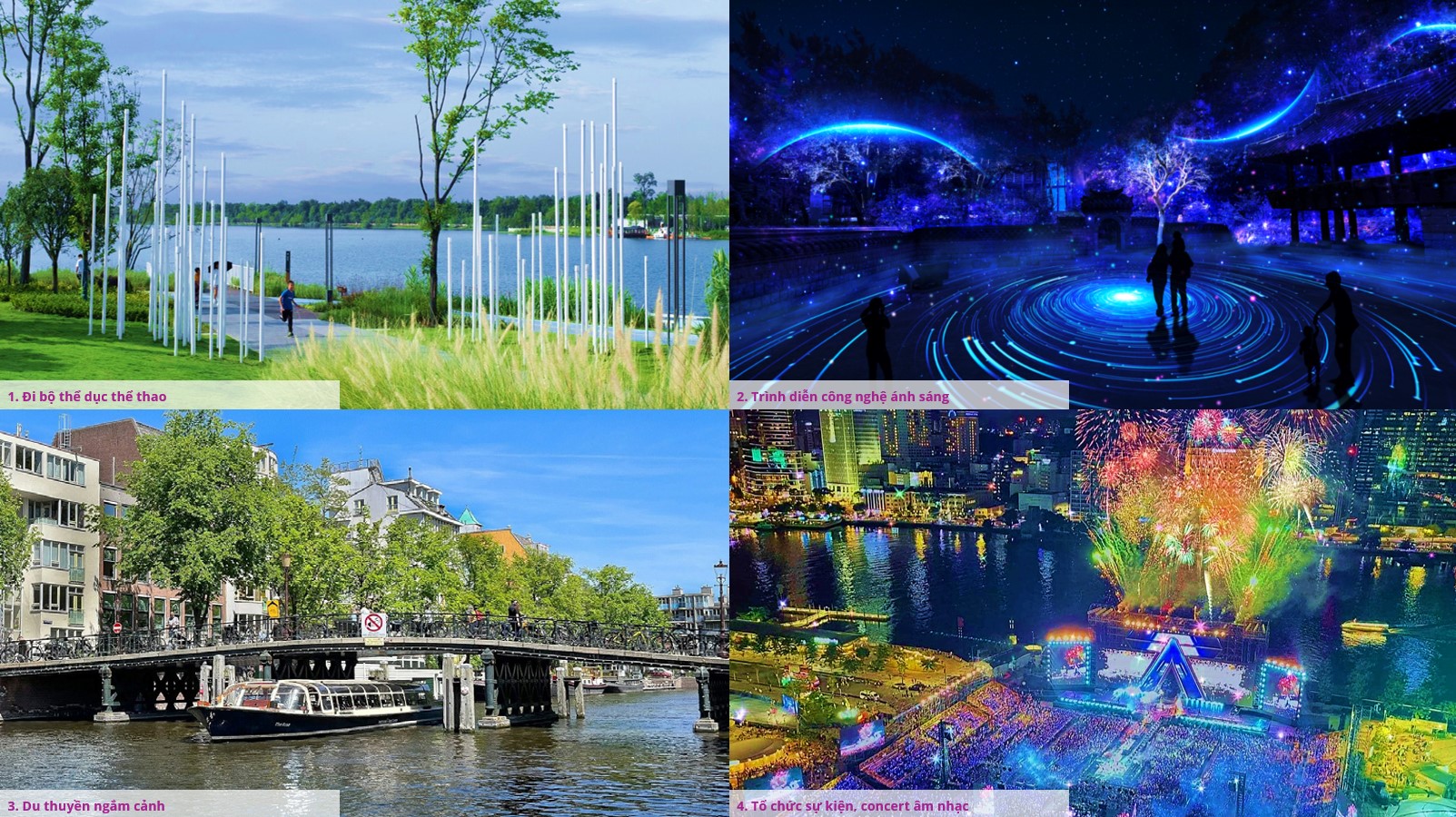 Ở sông Tắc là các đoạn như thủy nguyên, tuyền lâm, miệt vườn, sinh lực… thiên về văn hóa bản địa, sinh thái, trekking, kayak, camping và dịch vụ trải nghiệm ven sông. Mép sông mở và dễ tiếp cận, với bố cục nhiều lớp từ mặt nước, bờ sông, không gian công cộng, cây xanh và giao thông chậm, rồi mới đến công trình phía sau. Tức là tránh kiểu xây kín bờ sông, tránh tường rào và mặt đứng quay lưng ra nước; thay vào đó là tầng trệt mở, các khoảng lùi hợp lý, công viên tuyến tính, sân bậc xuống nước, điểm ngắm cảnh, quảng trường và các công trình điểm nhấn.