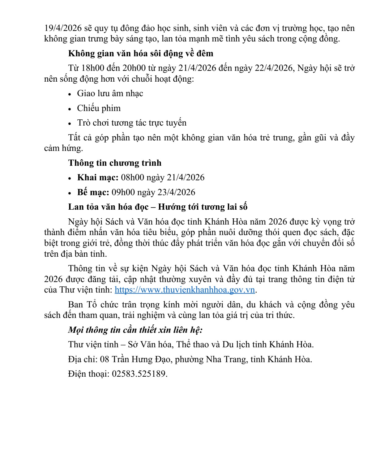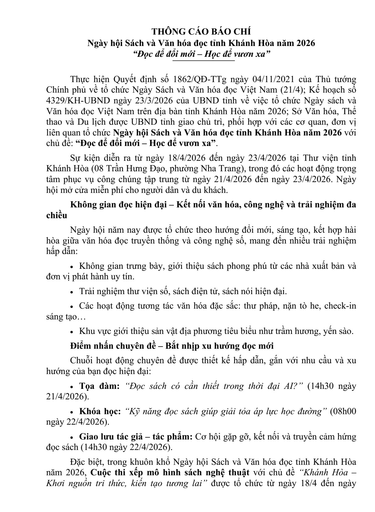 Ngày hội Sách và Văn hóa đọc tỉnh Khánh Hòa năm 2026 “Đọc để đổi mới – Học để vươn xa”
