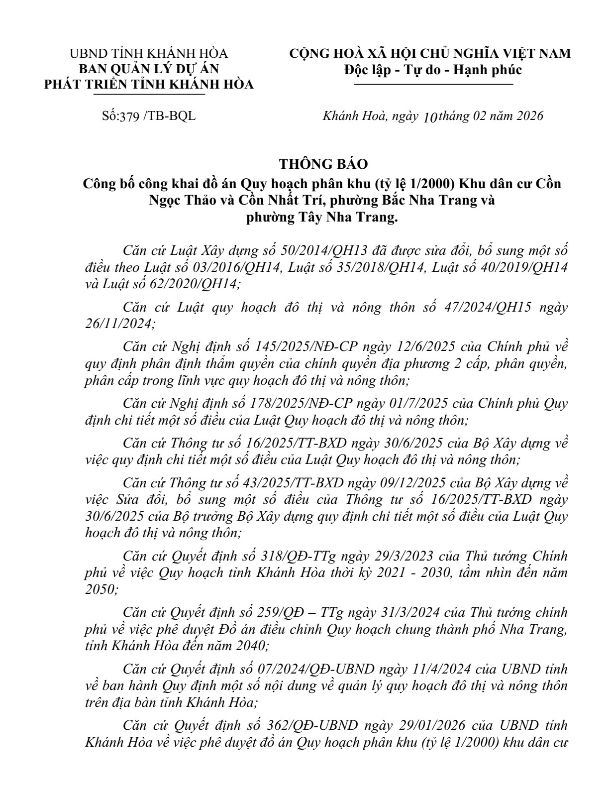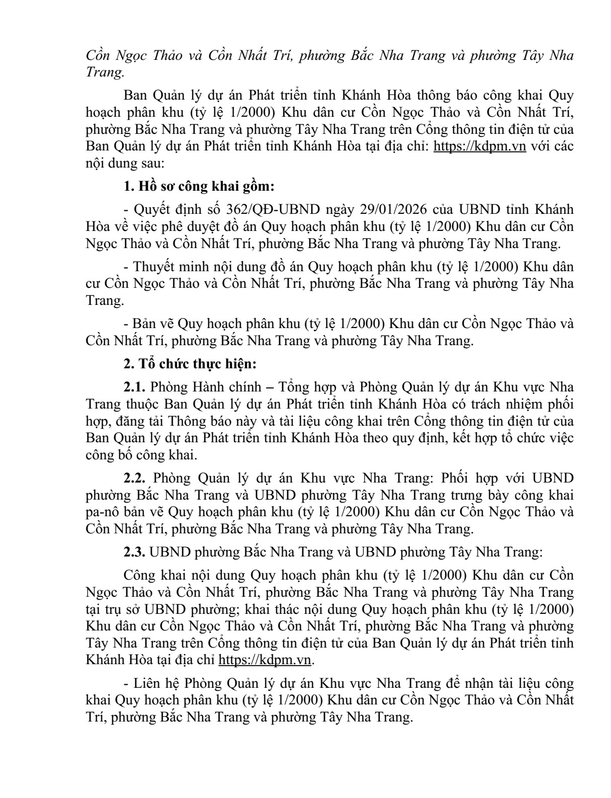 Quyết định về việc phê duyệt Đồ án Quy hoạch phân khu (tỷ lệ 1/2000) Khu dân cư Cồn Ngọc Thảo và Cồn Nhất Trí, phường Bắc Nha Trang và phường Tây Nha Trang